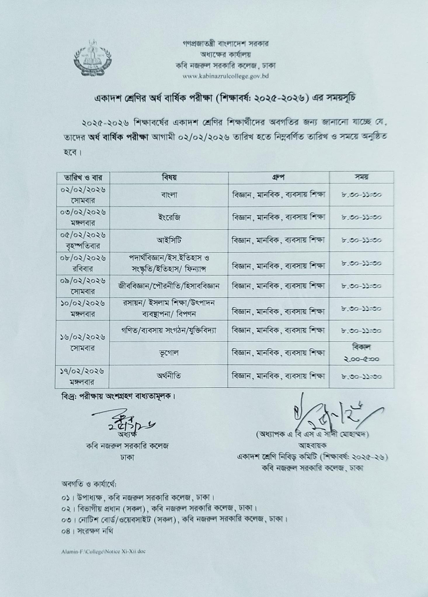 একাদশ শ্রেণি বার্ষিক পরীক্ষার সময়সূচি ২৫/০১/২০২৬