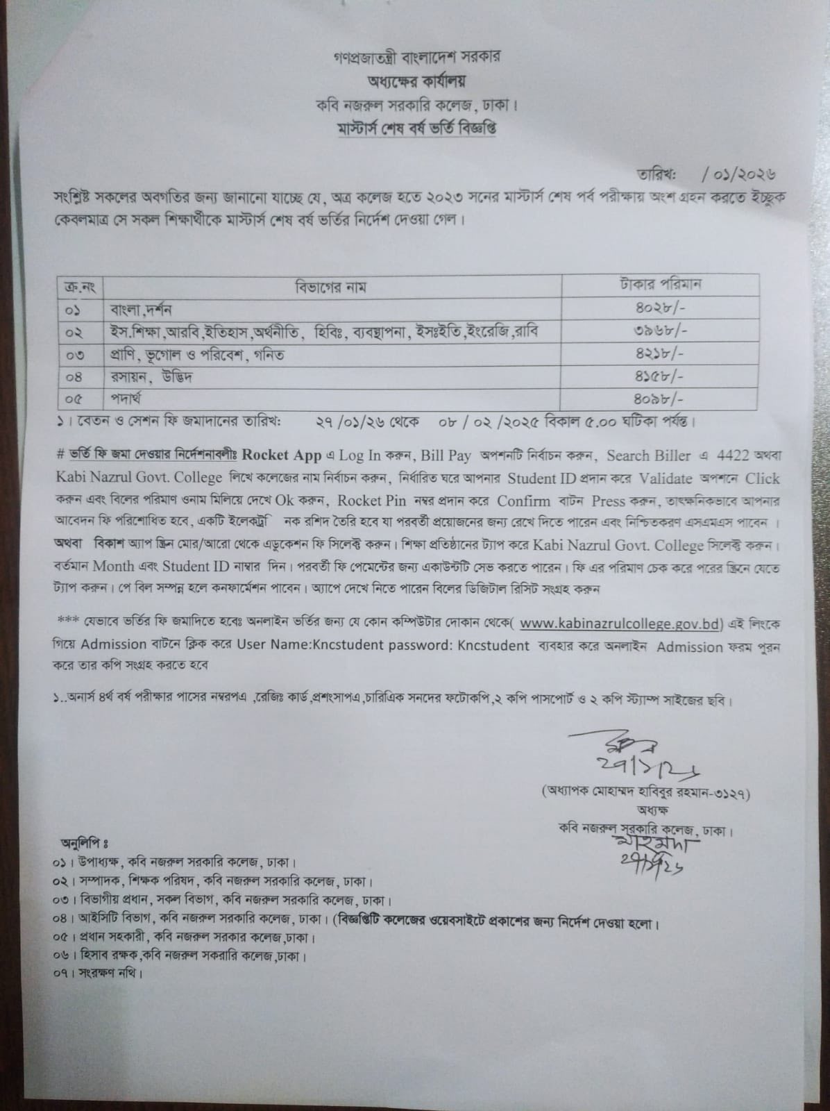 মাস্টার্স শেষ পর্ব ভর্তি ২৯/০১/২০২৬