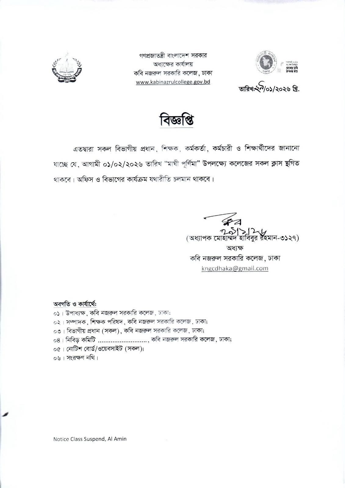সকল ক্লাস স্থগিতসমূহ নোটিশ ২৯/০১/২০২৬