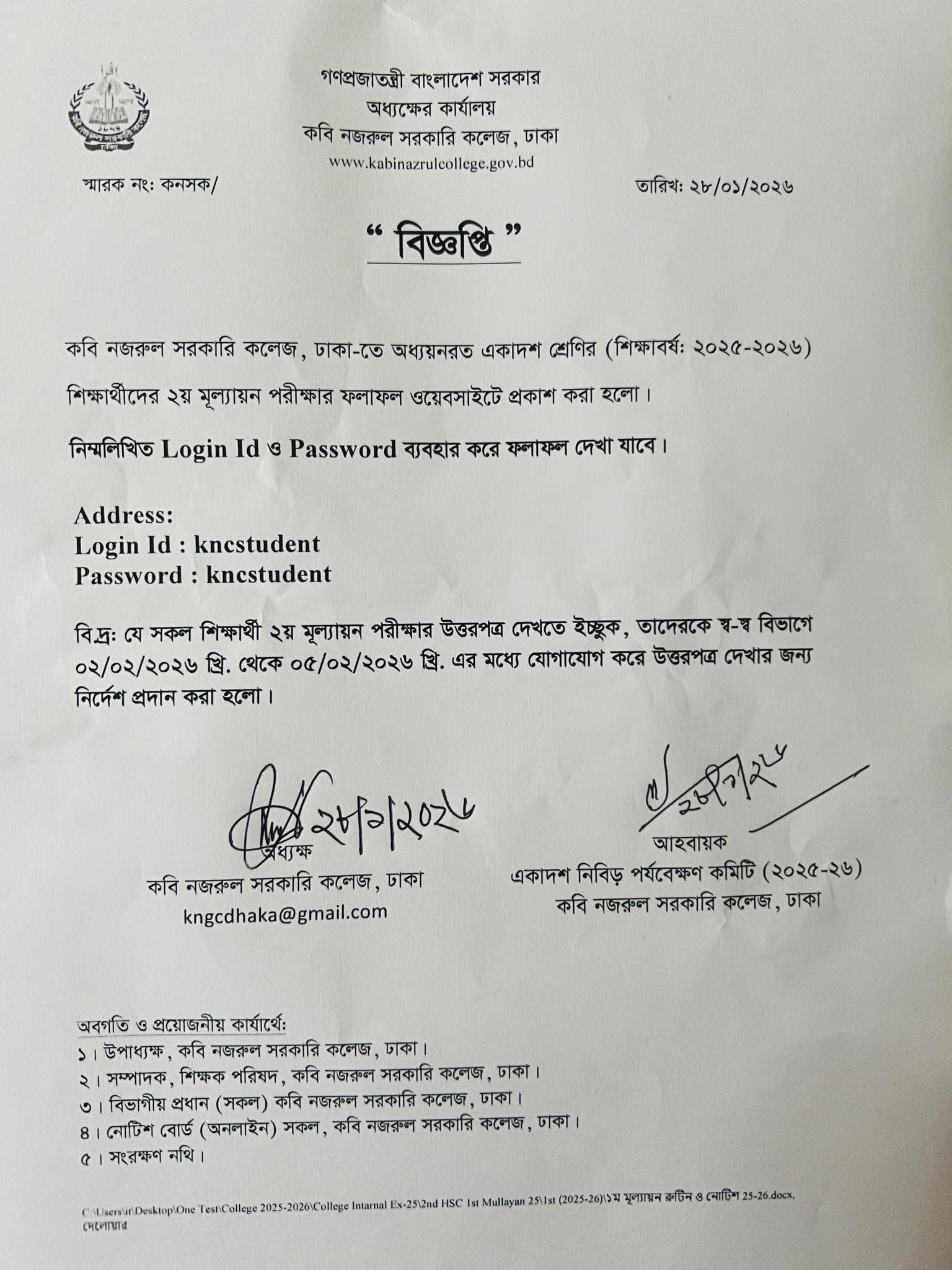 একাদশ শ্রেণি ২য় মূল্যায়ন পরীক্ষার ফলাফল প্রকাশ করা হলো ২৯/০১/২০২৬