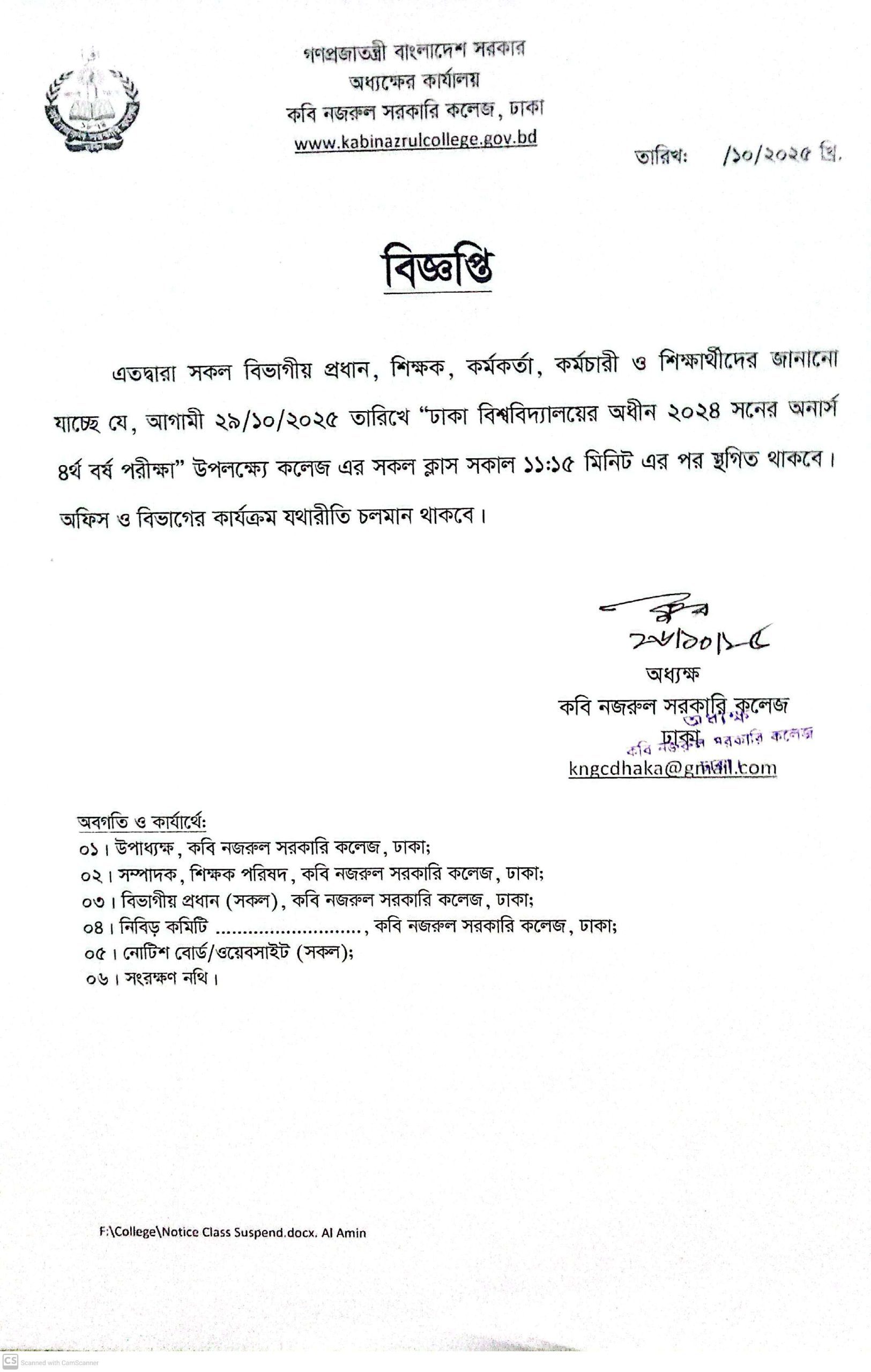 | অনিবার্য কারণবশত আগামীকাল ২৮-১১-২০২৪ তারিখ বৃহস্পতিবার কবি নজরুল সরকারি কলেজ, ঢাকার সকল... |